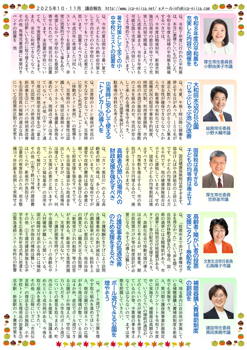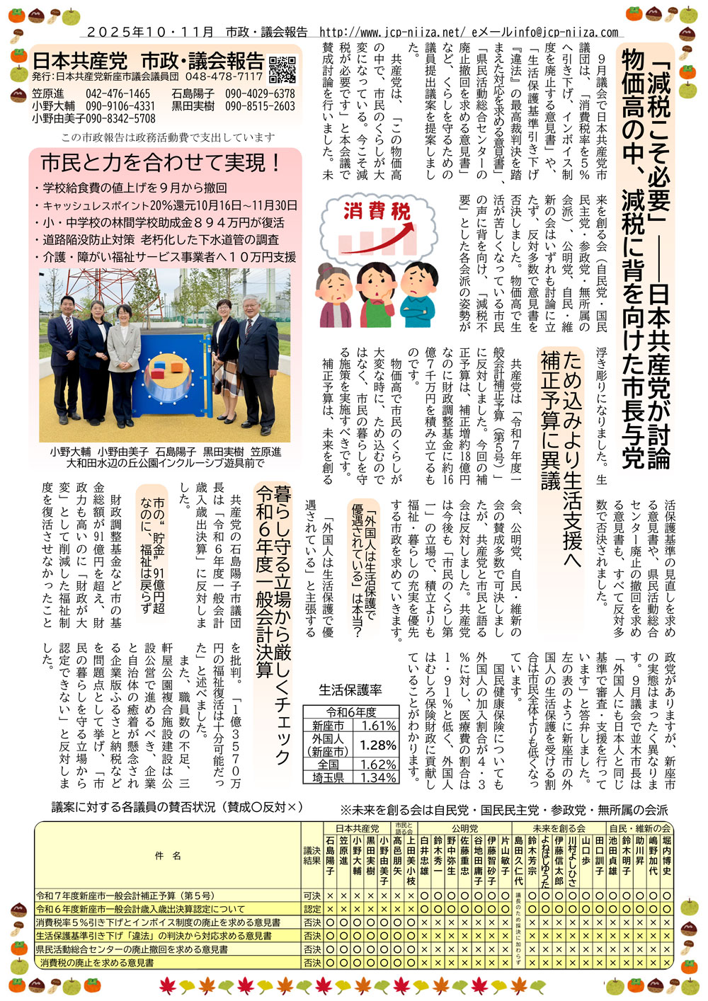 2025-10-19 / 最終更新日時 : 2025-10-26 machan 議会報告 2025年9月議会報告 2025年9月議会報告 日本共産党 市政・議会報告 2025年9月 ※ テキスト版は「にいざ民報」2025年10月19日付でご覧いただけます。 (2025年9月議会報告号) FacebookXBlueskyHatenaCopy